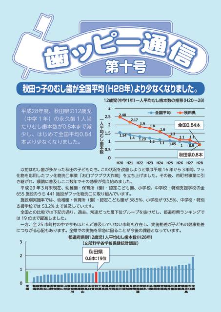 秋田県は10年ほど前までは県別全国比較でワースト10レベルでしたが、ぐんぐん順位を上げ、令和元年度調査では12位まで順位を上げました。学校他関係者の皆様のご理解とご協力の下、フッ化物洗口を積極的に推進したことが大きく影響していると思われます。